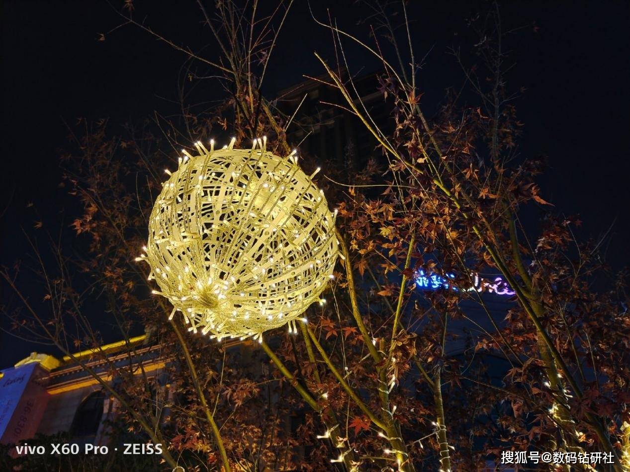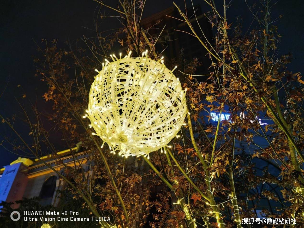 在夜景模式下,vivo X60 Pro的第二代微云台防抖优势体现得越来越明显。我们正真看到vivo X60 Pro画面中灯球高光区域的压制效果恰到好处,并未出现过度曝光的现象,灯球中每条编织纹理都清晰可见。相比之下,华为Mate40 Pro虽然整体亮度不错,但中央发光区域还是会有一定的模糊问题,如果你细心对比背景中发光的广告牌,也是同样的效果。