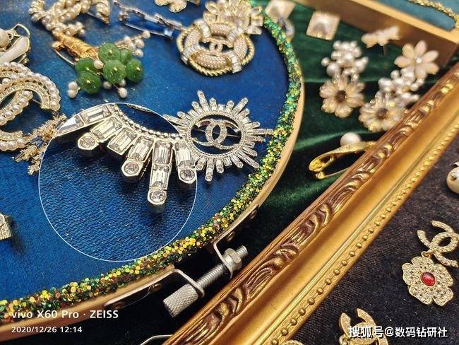 接下来是微距场景下的样张对比,从细节上看二者同样都能非常清晰的还原布料的纹理以及装饰水晶的透明光泽。但由于vivo X60 Pro的主摄像头光圈达到了f/1.48级别,因此要比华为Mate40 Pro的主摄像头拥有更多的进光量,因此即使是深蓝色的布料,画面色彩整体也更明亮一些。